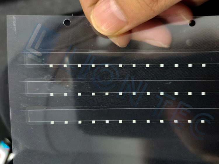 高解析UV噴碼機,配合UV白墨,在長條厚膜上清晰噴印白色圓點標識。UV白墨不堵噴頭,低成本(相比較白墨小字機),低維護率。