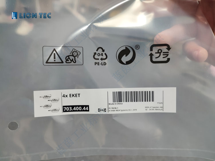 這是宜家家居通過藍茵UV噴碼機在PE塑料包裝袋圖案標識、條碼、文本、logo的高清晰打標打碼