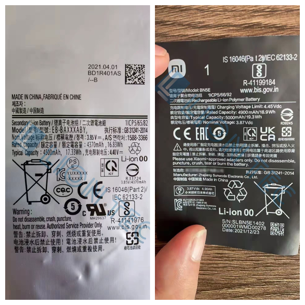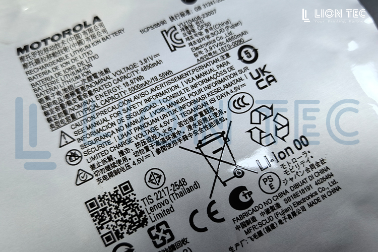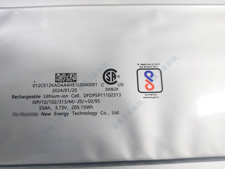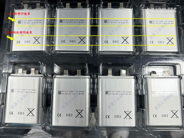 鋰電池行業客戶,原有的噴碼設備是小字符噴碼機,打印字母數字還可以,但隨著行業規定的變化,電池上打印的內容涉及到了二維碼和一些圖標,慢慢的發現原來的點陣式小字符噴碼機不能滿足二維碼、圖標的高清晰、高識別率的需求,設備升級客戶得知了UV噴碼機與印刷體一致的打印性能后,找到了藍茵,并進了打樣測試,以下是打樣效果。